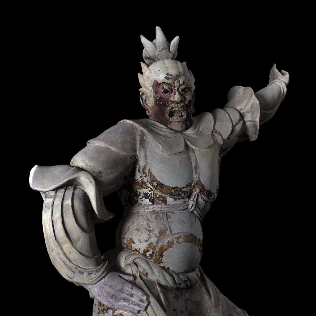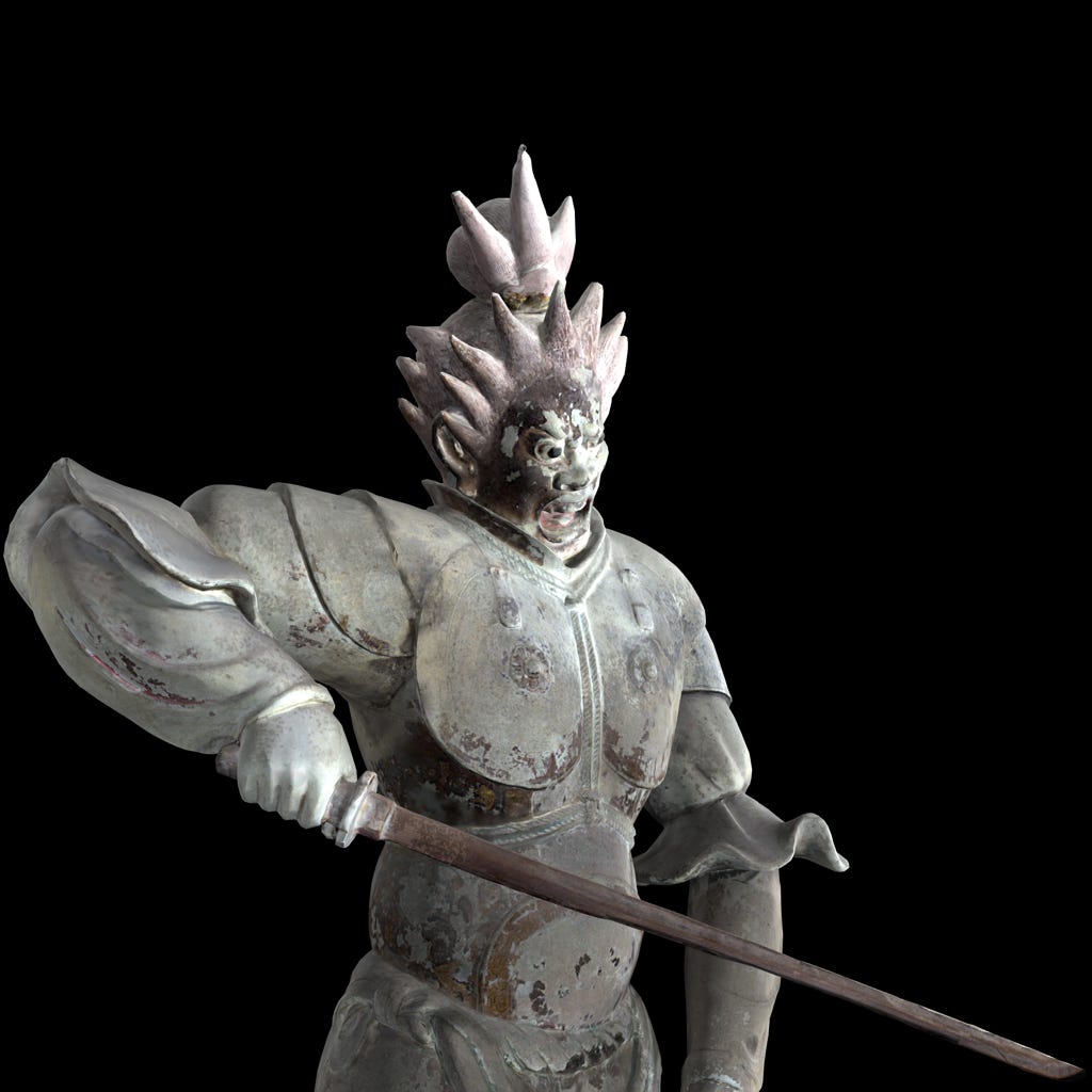 これらの像は角材と木片を組み合わせた心木に荒縄を巻き、三層の塑土で形成され、表面には白土地・金箔地に彩色が施されている。黒目の部分にはまるいガラス玉を嵌入している。肉身部は朱や緑青で彩色され、目や唇、ひげも精巧に描かれる。甲や兜には金箔地が使われ、唐草文や湧雲文が墨描きや彩色で表現される。火炎唐草文が特に珍しい装飾である。